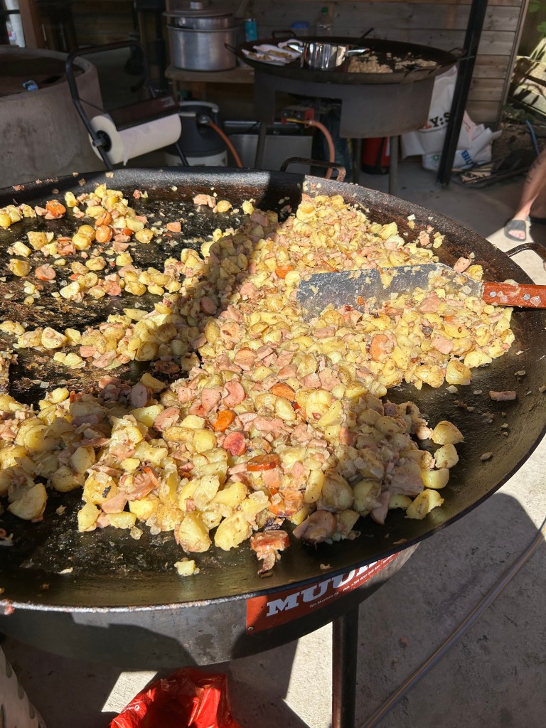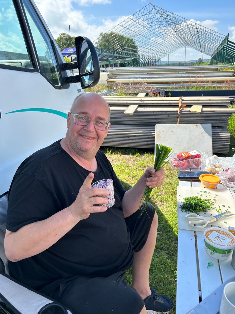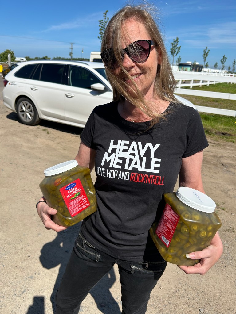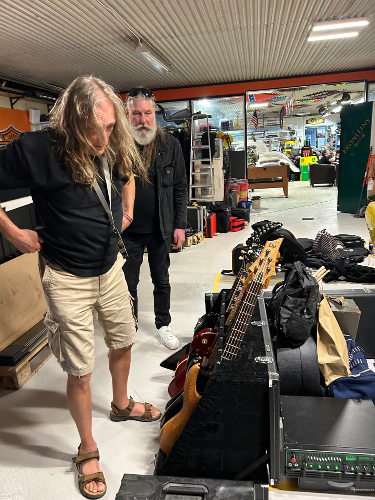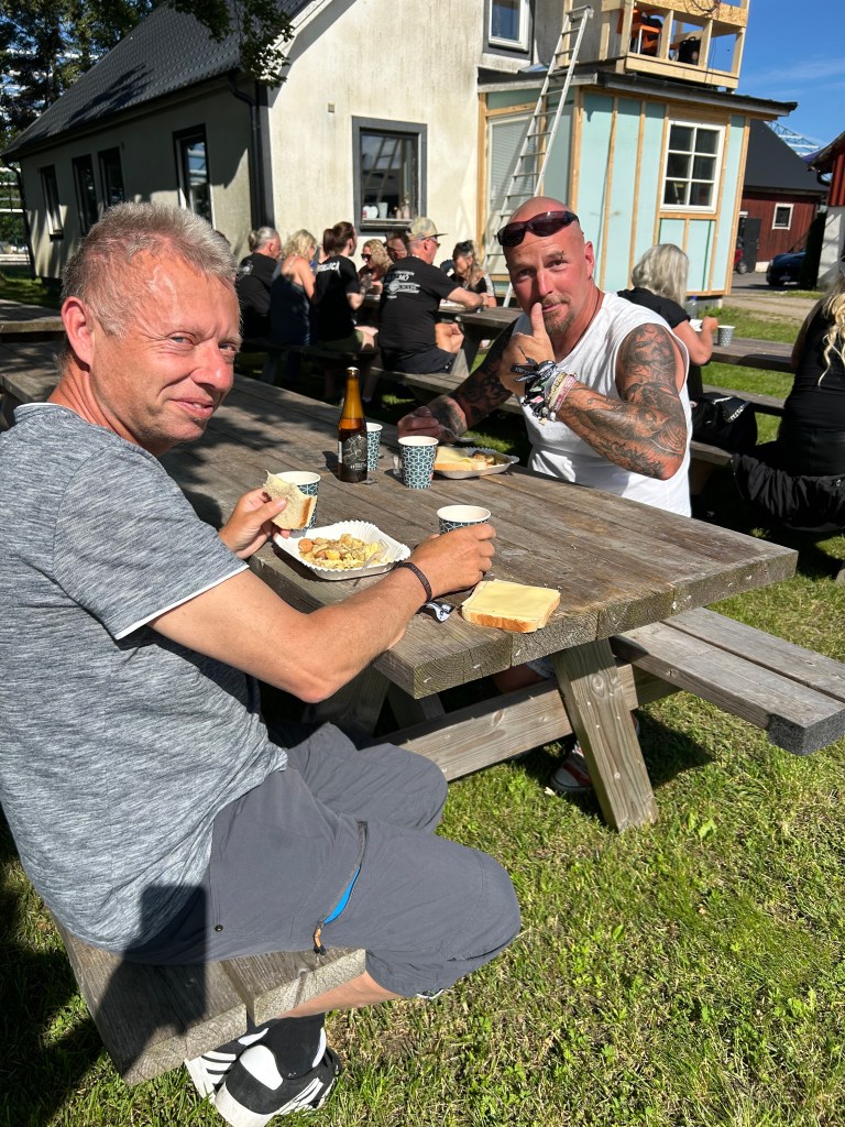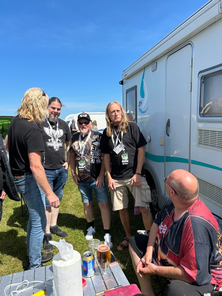 Steelwings anländer med fyra femtedelar. Gert-Inge fattades men dök upp lite senare. De levererade merch på campingen. Tatueraren fixar till maskinerna och är redo att gadda dem som vill. Paninivagnen är igång. Detta är Midsommarrocken. Det är familjärt. Det är så mycket rock ´n roll-känsla. Ni vill inte missa det.