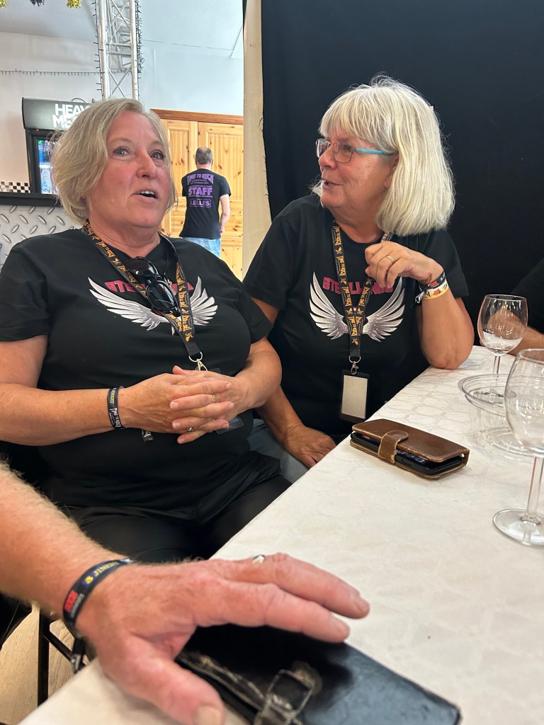Det utbryter ett gapskratt bland alla runt Steelwings. Där sitter filmkritikern Ronny Svensson och där sitter rockstjärnan Doro Pesch och Eradikated. Längst Helge å går Hardcore Supestars sångare Jocke Berg och värmer upp inför deras spelning klockan 13.45. Han gör några yoga-övningar och värmer upp rösten. Buffén för artisterna denna dag består av raggmunk och fläsk. Det finns en fin sallad till. Steelwings är återigen med i hetluften.