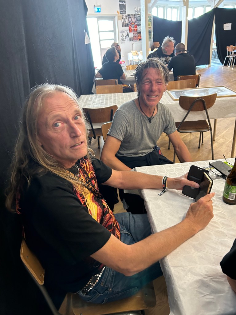 Anita, som är Gert-Inge Gustafssons fru, och Mia Stellas som är Tommy Söderströms dito skrattar tillsammans över ett glas vin. Jag frågar trummisen Marcus Fritiofsson kring hur han känner inför spelningen.